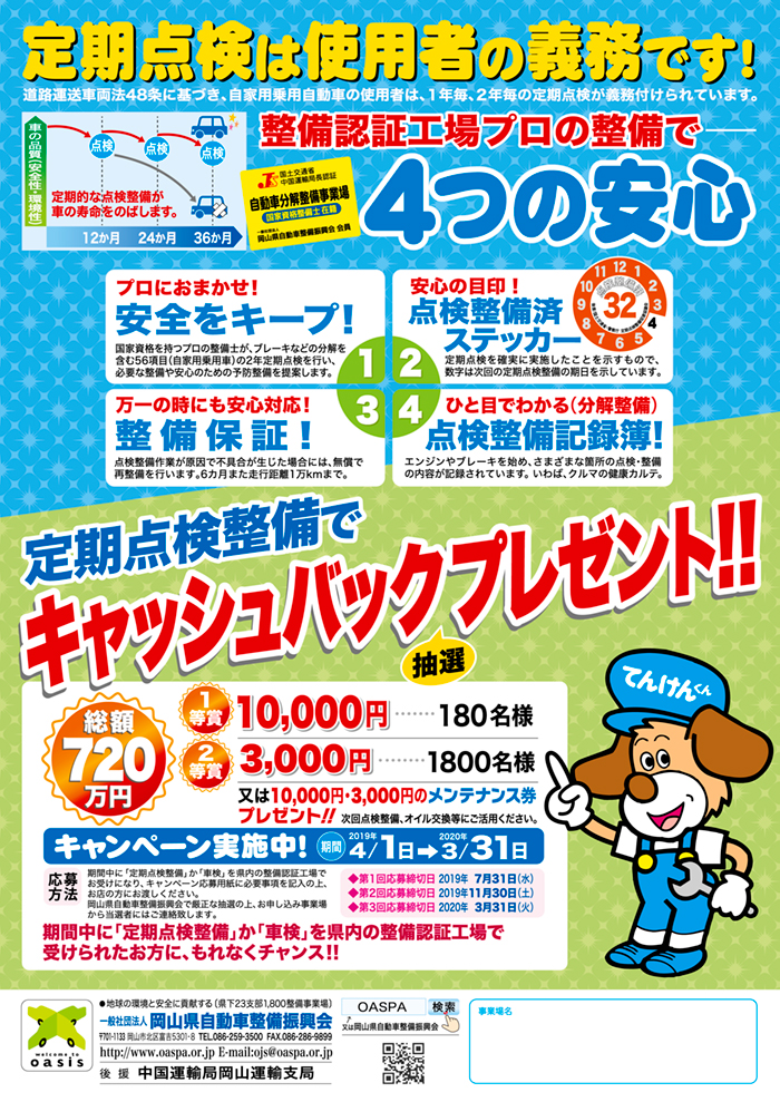 - 定期点検整備でキャッシュバックプレゼントキャンペーン実施中!